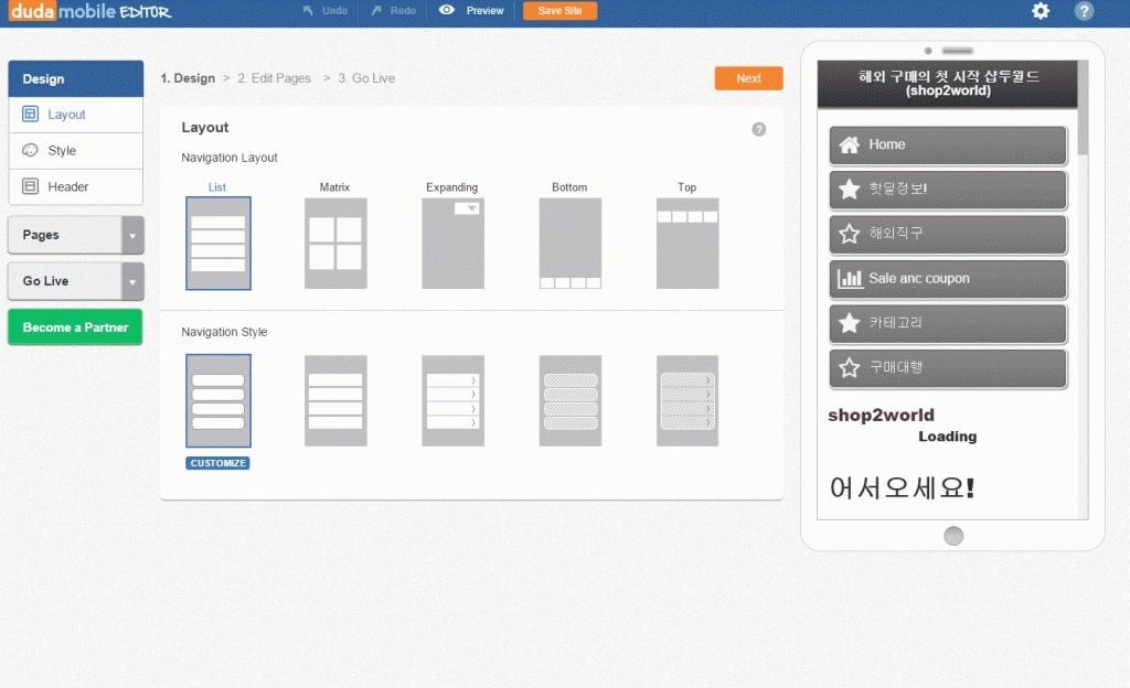 DudaMobile 입니다. 기존 웹사이트를 모바일 사이트로 변환해 주는 서비스에요.
